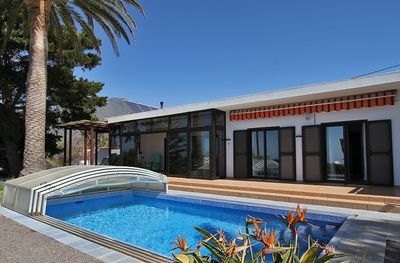 La característica especial de esta casa de vacaciones es la gran piscina de agua salada, 4 mx 8 m, climatizada con energía solar, con una cubierta adicional fácil de abrir y cerrar. Incluso en invierno, la piscina tiene temperaturas tan agradables para nadar. El jardín ofrece más zonas diferentes. Un gran pino canario proporciona sombra a una zona de estar adicional con vistas directas al mar. En la parte baja de la propiedad hay un huerto con aguacate, manga, naranjas, limones y olivos, así como hierbas. Si las frutas maduras cuelgan de los árboles, puede usarlas y probarlas.